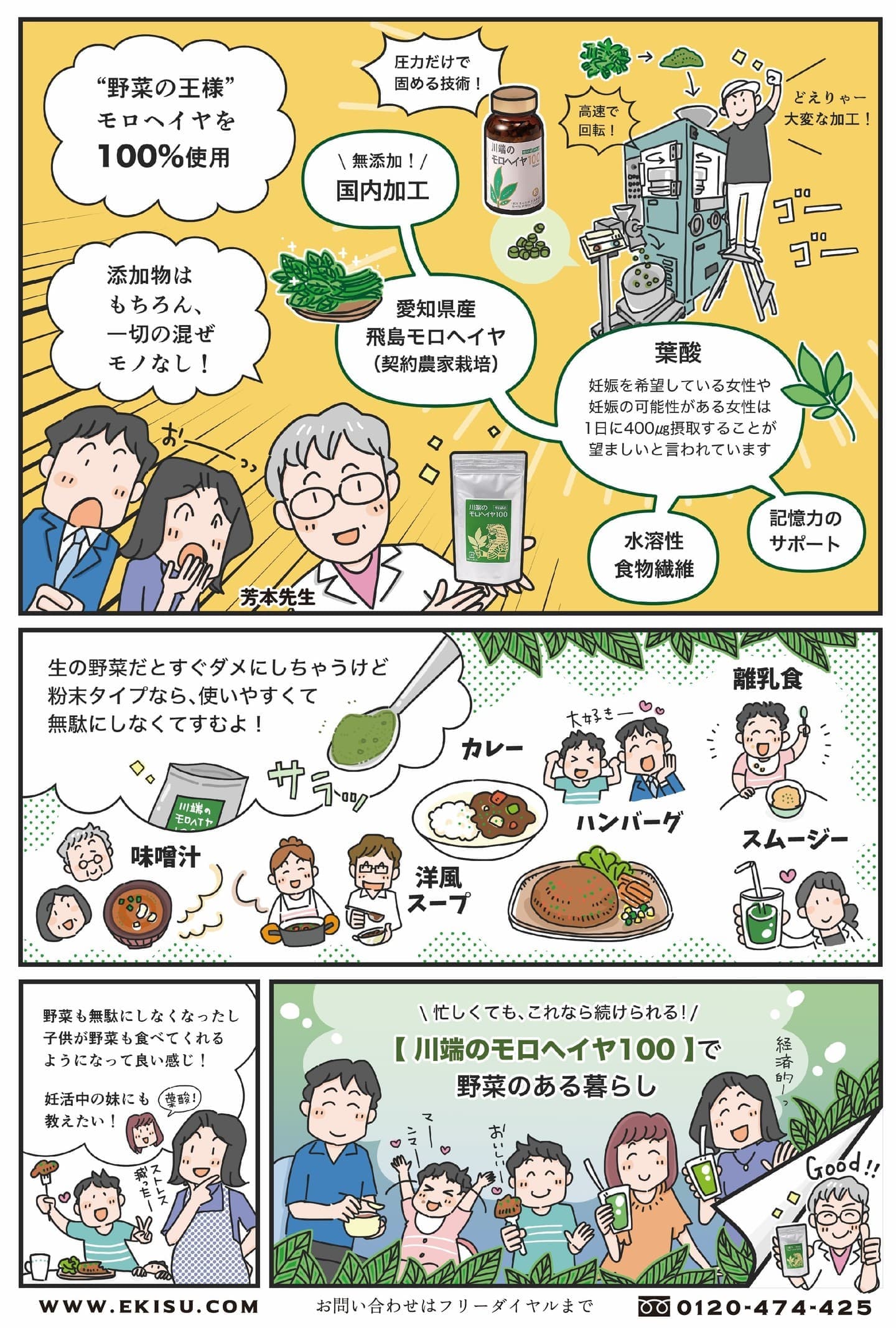 | 特 徴 | 契約栽培されたモロヘイヤが【川端のモロヘイヤ100】の唯一の原材料です。主に葉の部分だけを乾燥・粉砕します。賦形剤など一切使用していない証が【モロヘイヤ100】というネーミングに現れています。生葉のままでは青くささが気になる方にも、オススメいたします。保存料や着色料は一切使用していません。 |